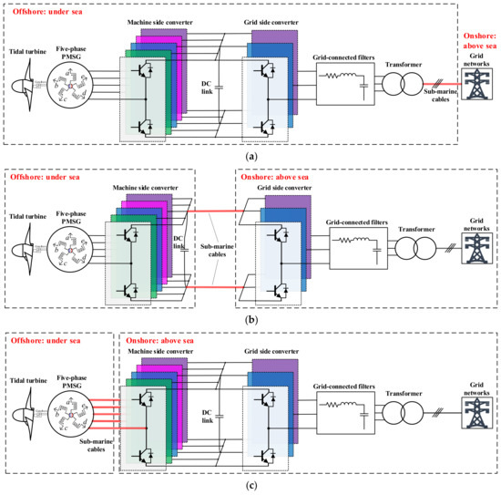Configurations of back-to-back tidal current energy conversion systems integrated five-phase PMSG: (a) machine and grid side are installed offshore and transmission via submarine cables; (b) machine side in offshore and transmission via submarine cables to onshore grid side; (c) five-phase PMSG is installed offshore, transmission via submarine cables to onshore machine side converter (MSC) and onshore grid side.