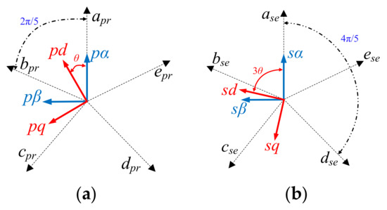 where p is the number of pole pairs and ωm is mechanical angular velocity of five-phase PMSG. Φ1 and Φ3 represents the magnet fluxes yielded by the stator windings corresponding to the fundamental and 3rd harmonic components of the back-EMFs, respectively. φ1 and φ3 are defined as the corresponding initial phase angles. By a generalized Concordia transformation depicted in Figure 5, the five phase PMSG can be decomposed into three sub-generators, the principal, the secondary and the homopolar ones corresponding to three sub-spaces. Since the neutral wire is not connected and the stator windings are star-connected, the last sub-generator will be not available in healthy mode. In the principal sub-space, the original, Concordia’s and Park’s frames can be indicated by different axes with (apr, bpr, cpr, dpr, epr), (pα, pβ) and (pd, pq). Similarly, the three frames in the secondary sub-space are expressed by the axes (ase, bse, cse, dse, ese), (sα, sβ) and (sd, sq), respectively.