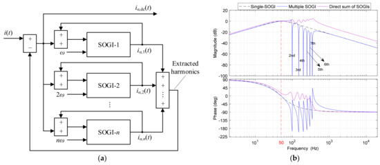 Description of multiple SOGIs and bode plot comparisons with different structures of SOGIs: (a) structure of multiple SOGIs; (b) bode plots of different design of SOGIs (e.g., extract 1st harmonic).
