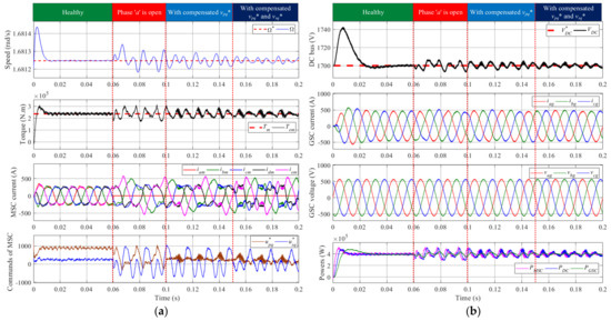In practice, the 10 times harmonic disturbances pollute all the control loops under the feedback frameworks of dual loops, which does not only affect the secondary sub-generator, as in the description in Table 2. As such, the 2nd, 4th, 6th, 8th, 10th harmonics are estimated and injected both to ipq and isq current control loops. Obviously, as depicted by the blue curve in Figure 17a, these additional interferences can be suppressed to satisfactory levels. Specially, it can be observed that the torque will contain negligible odd-order harmonics when the even ones are under-constrained, which are introduced due to the efficiency of harmonic estimation by the mSOGIs under the real-time variations of the mechanical speed that is used for harmonic resonances. Nevertheless, the compensated process guarantees the effective suppression of predominant harmonic disturbances, which inversely enhances the fault-tolerant availability of the system under the open circuit fault. Regarding the DC component in torque, the compensators maintain the level of torque since the multiple SOGIs can separate it out in real-time.