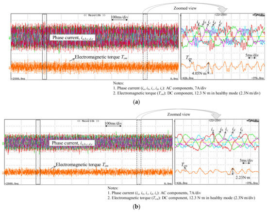 To fully understand the operational mechanism of the multiple SOGIs-based compensators, spectra of phase torque and phase current (here phase-“b” current is adopted) are respectively presented as Figure 17a,b. Firstly, the torque contains even order harmonic disturbances, where the 2nd, 4th, 6th, 8th and 10th components become significant (marked with a zoomed view as Figure 17a, which is modeled by Equation (21) and deduced in Appendix B. The 8th and 10th harmonic disturbances are also considered in the mSOGIs as the phase current contains not only 1st and 3rd harmonic components with a phase-loss but also higher odd order harmonic disturbances, such as the 5th and 7th. These two additional harmonics will further inject nonnegligible 8- and 10-times harmonics into the ipq and isq current control loops, respectively.