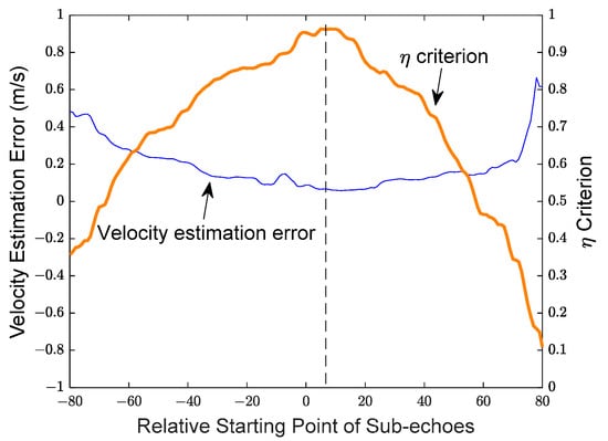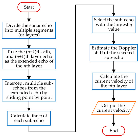 The flow chart of the accuracy selection method is shown in Figure 2. Firstly, the one-beam echo is divided into several echo segments with the same width as the transmitted pulse, and one segment is regarded as the echo of one water layer. Taking a segment as the center, a total of three segments nearby are selected as the extended echo of the current water layer. A time window with the same width as the transmitted pulse is used to intercept an echo from the beginning of the extended echo, which is called a sub-echo. Sliding the time window point by point until the end of the extended echo, multiple sub-echoes are intercepted in turn. The η criterion values of all of the sub-echoes are estimated, and the sub-echo with the largest η value is selected as the velocity estimation object. The velocity estimated from the selected sub-echo is regarded as the current layer velocity.