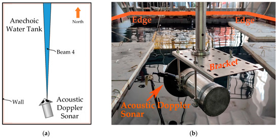 In order to test the estimation bias of the proposed velocity estimation method, a water tank experiment was conducted using a prototype Doppler sonar system in the laboratory. Since the walls and the bottom of the tank were equipped with sound-absorbing materials, the backscattering of the inclined sound beam was very weak. We fixed the Doppler sonar device horizontally on a bracket near the south wall of the tank, and made the fourth beam illuminate the opposite tank wall vertically. The advantage of this arrangement was that at least one beam could have a strong reflection echo. In order to verify the bias of the proposed method, three methods were used to estimate the bottom velocity: the proposed method in this paper, the MF method, and the WT method. In the tank experiment, we only compared the velocity estimation performance of the three methods for the fourth beam’s echo. The top-view schematic diagram of the experimental tank is shown in Figure 3a, and the photograph of the sonar prototype and the tank is shown in Figure 3b.