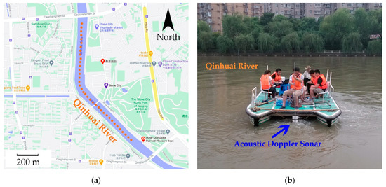 In order to verify the accuracy (suppression capability for random errors) of the proposed velocity estimation method, field experiments were conducted with a prototype Doppler sonar device in the Shitoucheng section of the Qinhuai River in Nanjing. The map of the experimental river section is shown in Figure 4a, where the orange dotted line represents the course of the survey ship. The experimental river section is about 1.5 km long, with a surface width of about 60 m, and an average depth of about 5.5 m. The survey ship was a catamaran garbage scavenger, equipped with a fuel engine. It was about 4 m in length and 2 m wide. Catamarans are more stable than other boats, and it is easy to install and fix instruments on them. The field photo of the experiment is shown in Figure 4b. During the experiment, the prototype was located in the middle of the bow, and was fixed in place by fixtures and ropes.
