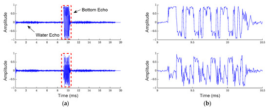 The echo samples collected by the fourth Doppler sonar beam in a single transmission are shown in Figure 5a, where the figures above and below are a pair of orthogonal waveforms obtained after the down-conversion. The total signal duration was 20 ms, the bottom echo arrived at around 9.15 ms, and the corresponding range was about 6.9 m. In Figure 5a, the bottom echo is shown in the red dashed box, which is enlarged and shown in Figure 5b. The envelope of the phase-encoded signal can be clearly observed from Figure 5b.