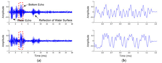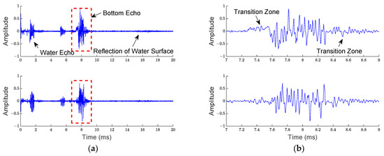 One-beam echo of the sonar prototype in the water tank experiment: (a) a pair of orthogonal down-conversion echoes; (b) the enlarged bottom echoes.