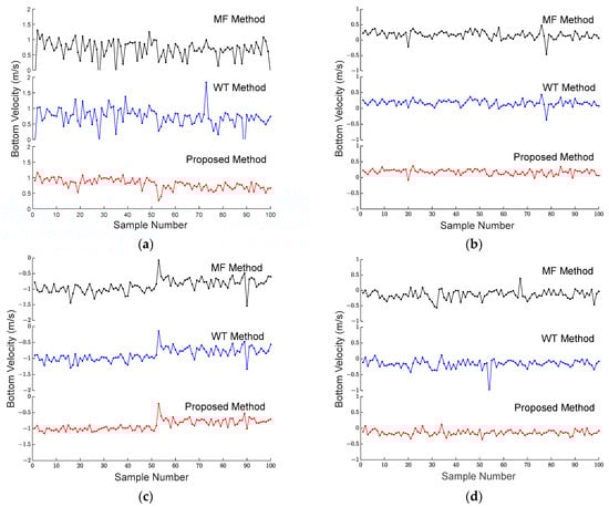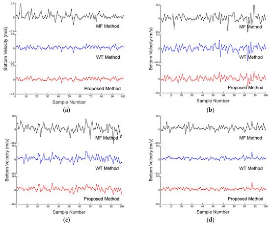 The proposed method, the MF method, and the WT method were used to estimate the bottom velocity of the fourth beam. Figure 6 shows the bottom velocity estimation results, with 100 sample points. The black, blue, and red curves represent the estimation results of the MF method, the WT method, and the proposed method, respectively. Three average velocity estimations are all close to zero, whereas the fluctuation ranges of the MF method and the WT method are clearly larger than that of the proposed method. Table 3 lists the mean values and the standard deviations of the bottom velocity estimations of the three methods, among which the mean velocity of the proposed method is closest to the actual velocity, and its standard deviation is the least. Compared with the MF method, the bias and the standard deviation of the proposed method were reduced on average by 86% and 91%, respectively. Compared with the WT method, the bias and the standard deviation of the proposed method were reduced on average by 97% and 89%, respectively. Compared with the other two methods, the mean velocity was closer to the actual velocity, which indicates that the estimation error of the proposed method is smaller, while the lesser standard deviation demonstrates that the accuracy of the proposed method is higher.