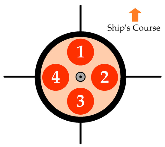 In the moving ship experiment, the ship sailed along the river’s centerline at a constant speed. The positional relationship of the four Doppler sonar beams is shown in Figure 9, and the arrow points in the direction of the survey ship. Beam 1 was aimed in the same direction as the ship, and its theoretical radial velocity was estimated to be about 1 m/s based on the ship’s velocity. Beam 3 was aimed in the opposite direction to the ship, and its theoretical radial velocity was estimated to be about −1 m/s based on the ship’s velocity. Beam 2 and beam 4 were aimed perpendicular to the sailing direction of the ship, so their theoretical radial velocity was zero.