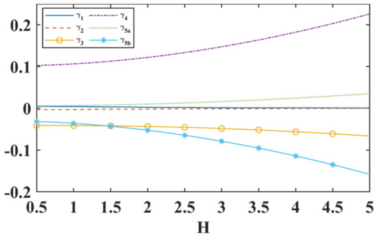 For internal rogue waves described by the triad equations, the interaction coefficients may differ drastically from unity, and thus rescaling would be necessary. As an illustrative example, we can consider an average ocean depth of say 4000 m. The corresponding interaction coefficients can be obtained from Figure 2 by choosing a non-dimensional water depth of H = 4, if we choose a reference length scale of 1 km. The numerical values of the coefficients are γ1 = 7.9946 × 10−4, γ2 = −5.4641 × 10−4, γ3 = −0.0562, γ4 = 0.1823, γ5a = 0.0244, γ5b = −0.1143.