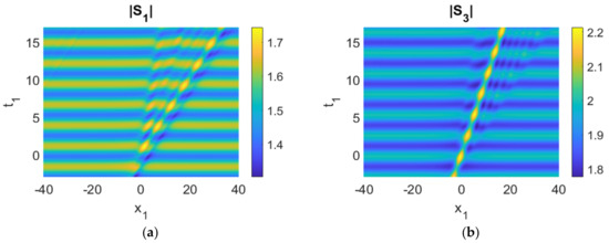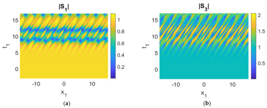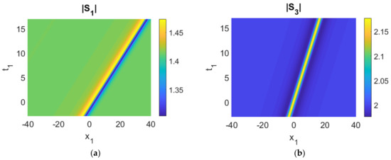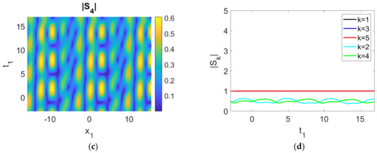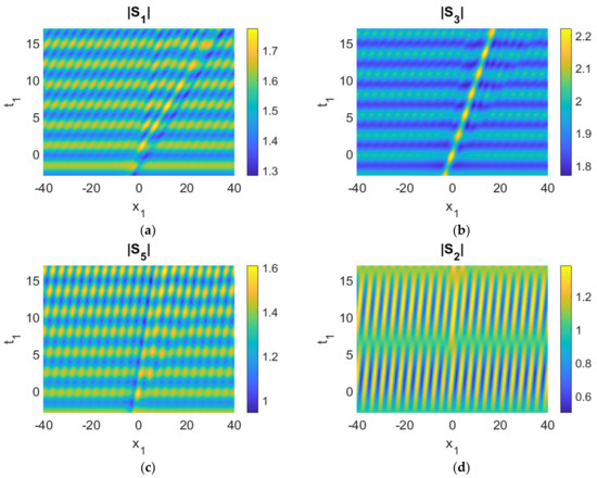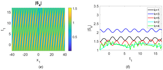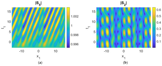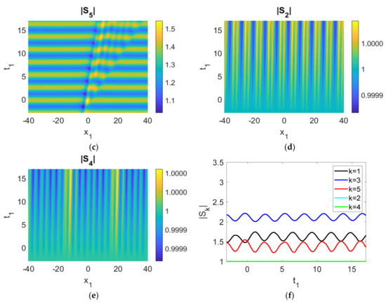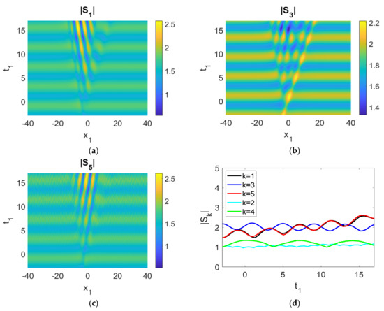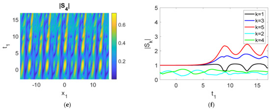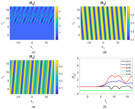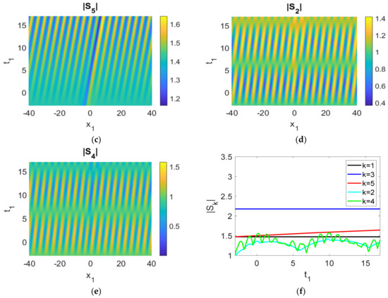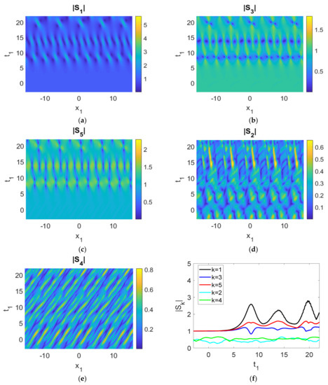 All components |Sk| (k = 1, 2, 3, 4, 5) display FPUT growth and decay cycles (Figure 10a–e). The propagation directions of |S2| and |S4| are different owing to the different signs of the group velocities, cg2 < 0, cg4 > 0. Energy exchange can be tracked by the locations of maxima of |Sk| (Figure 10f). Wave profiles |S1| and |S5| are roughly in phase: increasing and decreasing at the same time, while |S3| is out of phase, a manifestation of the signs of the interaction coefficients, γ1 = γ5a > 0, γ3 < 0. Simultaneously, energy transfer also exists among |S2|, |S4|, and |S5|. For a reasonably small time (t1 < 5 here), energy only moves between |S2| and |S4|, resulting from the small perturbations in the linear stage of modulation instability. For a larger time (t1 > 5), the energy flows among |S1|, |S3|, |S5|, |S2|, and |S4| in the nonlinear stage of modulation instability.