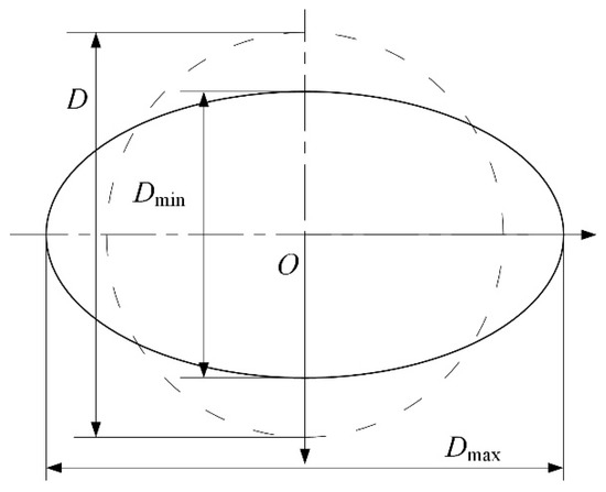 where Dmax and Dmin represent the maximum and minimum outer diameter of the pipe after deformation, respectively, and D represents the outer diameter of the pipe without deformation. The maximum and minimum pipe diameters are shown in Figure 2.