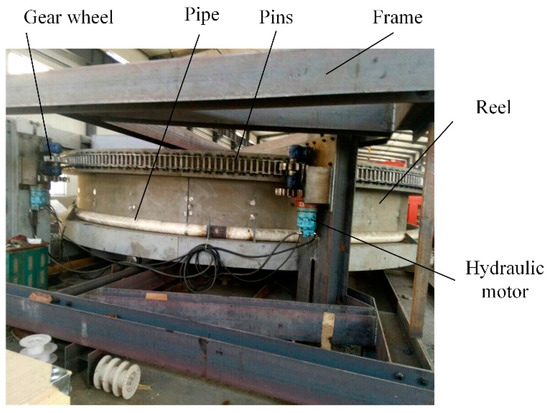 For the pipe-reeling test, an experimental system as shown in Figure 3 was designed, which mainly included: gear wheel, pins, reel, hydraulic motor, experiment frames, and test pipe. Compared with the experiments of other scholars [27,28], the setup of the test system was closer to the real working conditions. The reel was placed horizontally on the experiment frame, and four hydraulic motors were arranged around the frame as the driving device of the reel. Pins were evenly distributed on the reel and mesh, with the gear wheels on the hydraulic motor. A reel with a diameter of 8 m was selected for the experiments.