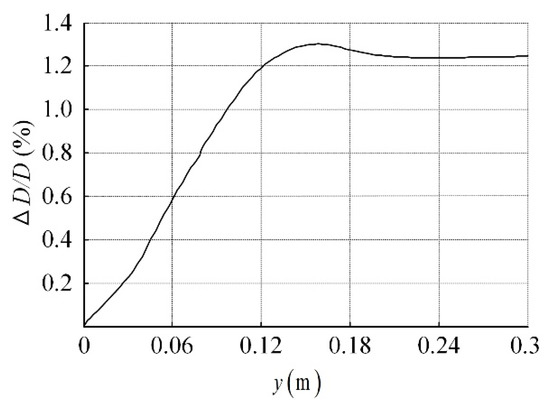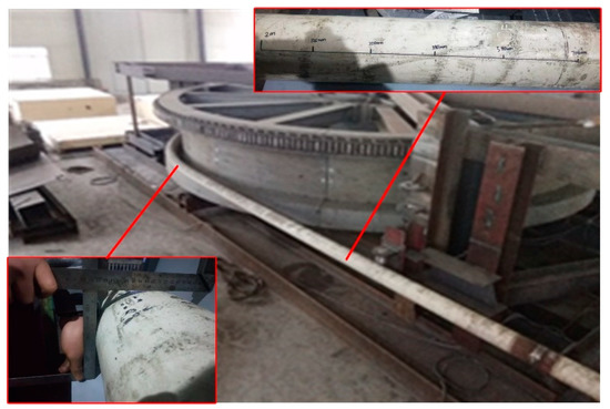 In order to correspond to the simulation case, the end displacement of the pipe in the simulation is converted into the reeling distance of the pipe, and different pipe-reeling lengths are selected, respectively. As shown in Figure 4, the deformation of the outer cross-section of the pipe is measured by vernier caliper, and the corresponding ovalization change is calculated. The overflow valve controls the working pressure of the hydraulic motor of the experimental device. Through the speed-regulating valve, the speed of the reel can be adjusted to control the reeling speed of the pipe. The pressure gauge can read the working pressure of the motor, and the output torque of the motor can be calculated through the working pressure and displacement of the motor. In order to ensure the accuracy of the results, the experiment was repeated three times with three different pipes of the same length.