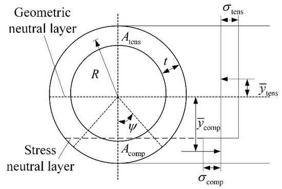 During the reeling process, it is assumed that the plane section is perpendicular to the middle surface of the tube section, as shown in Figure 5a,b. In addition, a small strain and limited rotation of the pipe section axes are assumed [29]. The strain of the pipe in the axial direction can be expressed as: