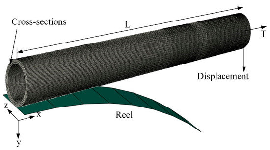 As a new submarine pipeline-laying method, the reel-lay method is increasingly used in offshore oil and gas development projects. At the onshore base, a series of short pipes are welded into one pipeline through the welding station, and reeled onto the reel by the shipboard equipment. Then, the pipe-laying vessel sails to the target sea area, and the pipeline is laid into the water through the cooperation of straighteners and tensioners in the pipeline-laying system [1,2,3]. Compared with the traditional S-lay and J-lay, the reel-lay method is faster, safer, and more efficient. When the pipeline is reeled onto the reel, the degree of bending of the pipeline almost reaches the limit, and the cross-section of the pipe will be obviously ovalized [4]. This will affect the structural performance of the pipeline, and structural instability may even occur in severe cases [5]. Generally speaking, increasing the radius of the reel can effectively reduce the ovalization of the pipe, but the increase in the size of the reel will pose new challenges to the design of the ship. Therefore, it is necessary to analyze the behavior of the pipe during the reeling process to ensure the safety of the pipe while taking into account the design size of the reel.