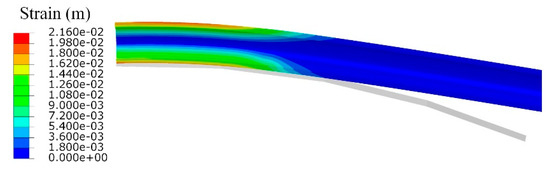 An FEM simulation of the reeling process of the pipeline was performed based on the above FEM model. Figure 9 and Figure 10 reflect the stress and strain nephogram when the pipe is bent along the reel. It can be seen from Figure 9 that the stress of the pipe almost reached the limit of material performance as the pipe was reeled up. However, Figure 10 shows that the obvious strain of the pipe is concentrated near or close to the rigid section, and the strain changes at other locations are relatively small.
