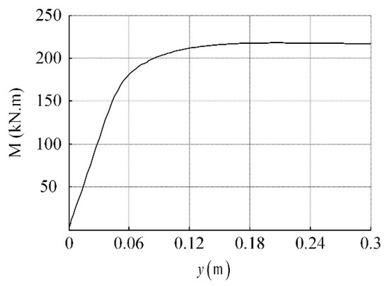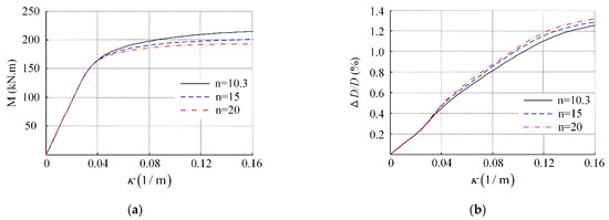 Similar to the yield strength, Figure 17a shows that when the hardening indexes are 10.3, 15, and 20, the maximum value of the calculation results of the ovalization changes are 1.27%, 1.29%, and 1.31%, respectively, indicating that the change of ovalization increases with the increase of the hardening index. On the contrary, it can be seen from Figure 17b that the maximum bending moment of the pipe decreases with the increase of the hardening index. The maximum values of the bending moment are, respectively, 214 kN·m, 200 kN·m, and 193 kN·m, and the pipeline will reach the limit state earlier because of the increase of the hardening index. The reason for the above phenomenon is that the enhancement of the hardening index makes the strain-hardening effect of the material increase, which leads to the strain of the pipe section being greater under the same curvature increment condition. Therefore, the pipe with a large hardening index will reach the limit of ovalization first, and the bending moment of the pipe will be reduced due to the increase of deformation.