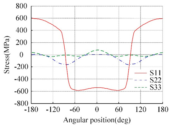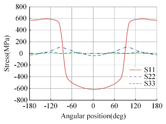 At the same time, taking the touch point between the pipe and the rigid plane as the origin, as shown in Figure 5a, the stress distribution in different directions around the touch point between the pipe section and the rigid plane is obtained. Figure 13 and Figure 14, respectively, show the stress distribution of the outer surface and inner surface of the pipe at the specified cross-section, where S11, S22, and S33 represent the three directions of x, y, and z, respectively.