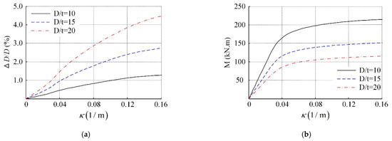 According to the requirements of marine engineering and related pipeline standards, pipelines with D/t values will be selected according to the actual situation in actual engineering applications. In order to study the influence of different D/t values on the ovalization and bending moment changes of the pipe cross-section, the D/t values 10, 15, and 20 were adopted. The change of the ovalization and the bending moment of the pipe cross-section with curvature are shown in Figure 15a,b.