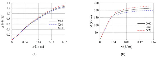 As an important indicator of pipeline performance, the yield strength has a very important impact on the pipeline. Therefore, under the condition that the geometrical parameters and other material parameters of pipe remain unchanged, three common marine engineering steels, X60, X65, and X70, with yield strengths 414 MPa, 448 MPa, and 482 MPa, respectively, were selected for analysis. The ovalization and bending moment change with the curvature of the pipes with different yield strengths are shown in Figure 16a,b.