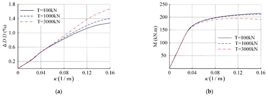 In most of reeling operations, the cooperation of the tensioner is required. Under the joint action of the reel and the tensioner, the reeled pipe will be subjected to the bending moment generated by the reel and the tension provided by the tensioner. Therefore, the axial tension provided by the tensioner will also have a very important effect on the ovalization and bending moment of the pipeline. In the finite element model, a 6-inch pipe with the same D/t value and material properties was selected as in the previous sections, and the tension on the right end of the pipe was set to 100 kN, 1000 kN, and 3000 kN, respectively. For the pipes subjected to different axial tensions, the variations of ovalization and the bending moment of the pipe cross-section with the curvature are shown in Figure 18a,b.