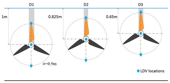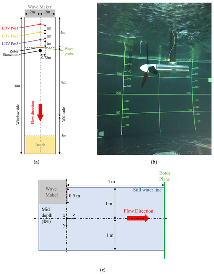 To study the effects of combined wave–current shear flows, laboratory-scale testing of a 1/20th scale HATT was undertaken. Figure 1a shows the setup as a plan view schematic and Figure 1b show a photograph of the experimental apparatus. Figure 1c shows a side view schematic. The turbine was mounted on a 0.105 m in diameter stanchion connected to a supporting structure above the 4 × 2 × 18 m wave and current flume of IFREMER [34], as seen in Figure 1b. The turbine was mounted at three different depths (1, 0.825 and 0.65 m) below the water’s surface (Figure 2), and centred in the cross-stream direction, 2 m from each of the side walls (Figure 1a).