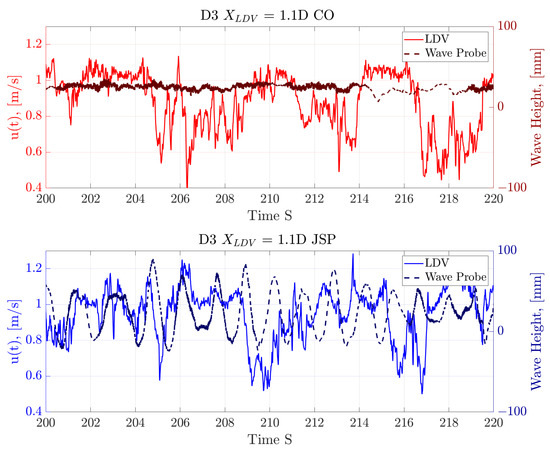 This section presents a review of the flow characteristics observed for the CO and JSP cases. Comparisons between the flow measurements made at each of the three upstream LDV positions and the supplementary measurements taken at the turbine rotor plane were made to confirm the nature of flow development approaching the turbine. Figure 3 shows an example time series of the LDV and wave probe data captured; the LDV data shown were captured for the D3 depth inline with the rotor hub.