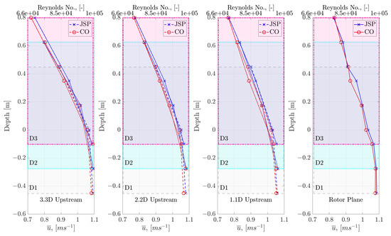 Figure 4 shows the mean flow velocity recorded at differing depths and differing upstream measurement positions. Figure 4 presents an upper x-axis indicating the chord length based Reynolds number, defined as: —where is the chord length of the blade at 0.7 of the radius, mm, is the density of water in kg m−3 and is the dynamic viscosity of water in . Immediately apparent is the drastic inverse profile created by the presence of the wave maker. A large blockage impinging on the flow arising from the submerged wave maker (as illustrated in Figure 1c) generated a clear shear layer which dominated the flow profile up to and presumably passed the turbine rotor plane. Evidence of flow recovery can be observed in the upper part of the water column as distance from the wave maker increases. The results indicate little difference in the observed mean flow velocities with the wave maker in action or stationary, i.e., with and without the waves. The profile developed, whilst inverted, shows similar flow velocity values to those observed in [24], albeit over a smaller depth.