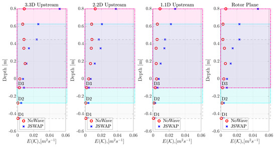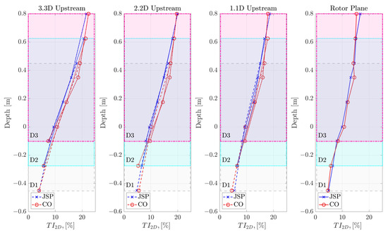 The CO cases generally exhibited marginally higher values than the JSP cases; however, the levels from both cases became almost equal in measurements taken at 1.1D and at the rotor plane. Interestingly, at 1.1D and the rotor plane for the highest point measured (0.8 m), a higher value was observed for the JSP case than for the CO case. Although very similar values were observed in both cases, these findings could be consistent with turbulent effects predominating over wave effects as the driver of fluid velocity fluctuations. As the downstream distance from the wave maker increased, the turbulence energy decayed, and the orbital effects from the wave became more significant, relative to turbulence, in creating fluid velocity fluctuations. Presumably, the motion of the wave maker reduced the turbulence observed, as it was not present as a constant blockage, as in the CO case, which meant the blockage would be reduced at times (due to the motion of the paddle out of the water) and would have been moving with the fluid flow at other times. Lower down the water column, in the region −0.45 m < depth < −0.2 m, consistent values were observed for all upstream positions.