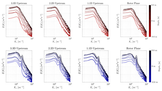 Figure 6 shows the resulting PSDs plotted at differing positions, with the upper charts showing the CO case and the lower charts showing the JSP case. The findings are consistent with observations made above: essentially, a reduction in energy at low can be observed approaching the turbine rotor plane, and a more substantial reduction can be observed with depth—these findings can be observed for both the CO and JSP cases. Each plot generally tends towards the slope indicating that in general the measurements captured a portion of the inertial sub-range. At greater depths, where lower TI and higher Reynolds number were observed, some deviation from the slope can be observed—this is common to all traces but was seen to be most remarkable closer to the wave maker (at 3.3D). A difference in peak spectral energy for the highest point in the water column measured of 0.031 m2 s−1 was observed between the 3.3D upstream case and the measurements made in the rotor plane.