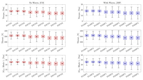 In this Section, the bulk statistics of the operational loads measured for each case are compared, facilitating a comparison of the rotor performance at different rotor depths, with and without the superimposed irregular waves. Figure 8 presents the box plots of the data recorded for torque, thrust and out-of-plane BRBM, . The horizontal line within each box indicates the median values of the dataset; the upper and lower bounds of the boxes show the upper and lower quartiles of the dataset, whereas the error bars indicate the maximum and minimum values observed—(note: data points a distance of 1.5 times the interquartile range away from the upper or lower bounds of the box have been omitted as outliers to aid presentation). The circles indicate the mean values for the datasets recorded; repeat cases are shown individually.