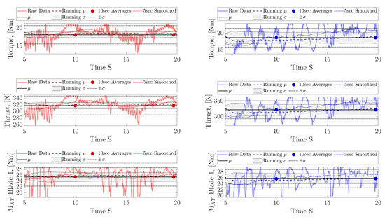 Figure 9 shows that the mean and standard deviation converge to fixed values within a relatively short amount of time—a length of time far shorter than the length of the datasets gathered, giving us confidence in the statistics presented. In the rotor measurements, torque and thrust, the effect of the wave is relatively pronounced, and oscillatory behaviour arising from the wave can be seen in the right plots for torque and thrust. The effect of the wave is less clear in the blade BRBM plots, which exhibit a significant oscillation in both the CO and the JSP cases, which was presumably due to the rotation of the device through profiled flow. These plots starkly highlight effect of the phase deconstruction when summing blade loading over the rotor, as detailed in [39].