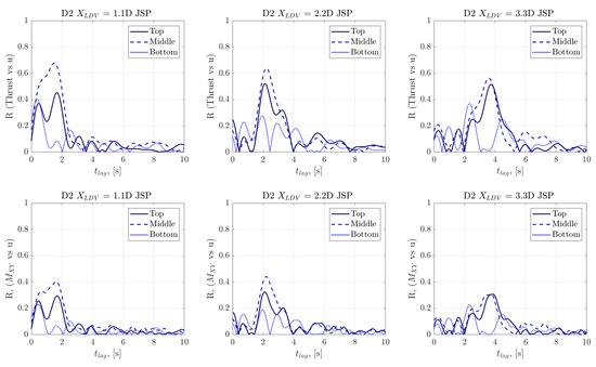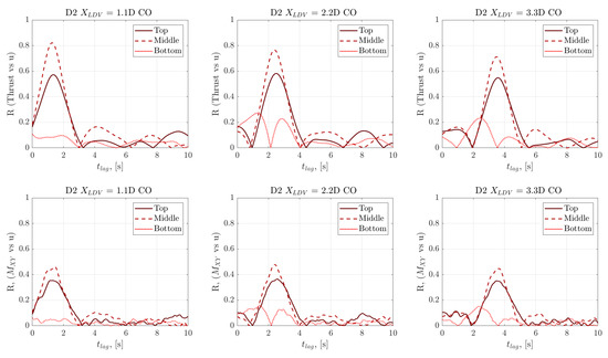 Development of the cross-covariance coefficient at lag values differing between LDV measurements and rotor torque measurements. Upper charts show the thrust, whereas the lower charts show out-of-plane BRBM correlations with the fluid velocity measurements.