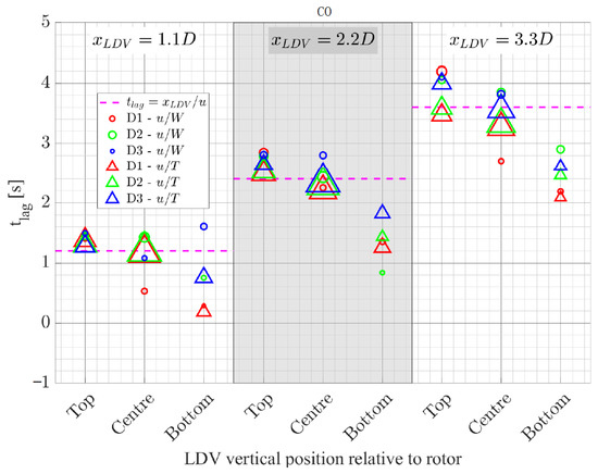 Figure 11 shows a summary of the time values observed for the peak cross-covariance coefficients calculated between the LDV and the rotor thrust signals () and between the LDV and the wave probe signals (). The figure is supplemented by dashed lines representing the theoretical time lag values estimated utilising Taylor’s frozen hypothesis, which states that, for relatively small levels of turbulence, the turbulence structures are carried with the mean flow. As such, the theoretical time lags were calculated via . Within Figure 11, the horizontal axis is divided into three sections, one for each of the upstream distances between the LDV position and the rotor positions (1.1D, 2.2D and 3.3D). For the CO case in Figure 11, it seems that when the horizontal position of the LDV probe was closer to the rotor and the vertical position was in line with the centre of the rotor, the calculated lag had the best match between the theory and the cross-covariance function. For all , when the LDV is positioned at the top of the rotor, was higher than the theory and when it is positioned at the bottom of the rotor it is lower than the theory. This behaviour is consistent with the velocity depth profiles shown in Figure 4 in which the flow slows down as it gets closer to the water’s surface.