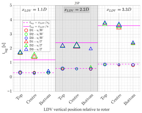 Comparison of lag between LDV, wave probe and thrust transducer signals obtained from cross-correlation for irregular wave cases. Three vertical sections for each LDV streamwise position. Filled markers are for cross-correlation between and empty markers for . Different marker colours indicate different rotor depths. Each section is divided in three for each LDV vertical position relative to the rotor: top, middle and bottom. The size of a marker is relative to the R value of the cross-correlation function ranging from 0.2 to 0.8.
