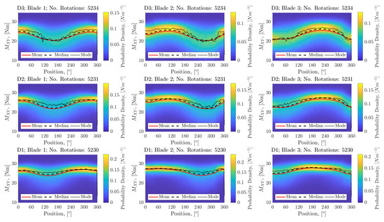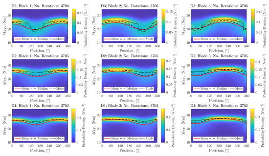 Figure 14 shows, for the CO case, the probability density function for against rotational position plotted as a surface for each turbine depth. Overlaid onto the plots are the mean, median and modal averages. The figures show clearly that the TSA process can be used to develop and understanding of the “average” cyclic load on the blade root and can be used to characterise the effects of both the flow profile and the turbulence profile in terms of the probability of the blade generating a particular value of given the blade position.