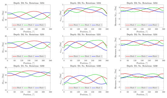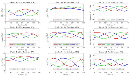 A statistical analysis of the variation of the out-of-plane BRBM, , with turbine positions, is presented for each blade. The approach here is to characterise the effects of operating with differing portions of rotor in the shear layer developed, as detailed in Section 3, by analysing the device’s operation at the different depths, with and without the presence of the irregular waves. The positional analysis was utilised to observe periodicity in the loading statistics due to the rotation of each blade through the shear layer and profiles (both velocity and turbulent) observed in the flow. To undertake this analysis, time synchronous averaging (TSA), as detailed in [40], was utilised. This involved re-sampling the data for each case onto specified rotor positions, which was achieved by utilising the synchronised encoder measurements. The relatively long datasets facilitated a statistical description of the BRBM for each of the re-sampling positions, as the data from the three experiments conducted for any particular depth and wave cases were combined, giving approximately 3700 and 5200 rotations over which the statistics were developed for the CO and JSP cases, respectively.