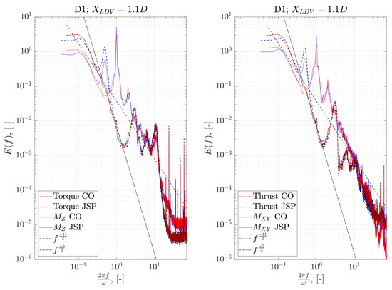 To observe the distribution of load fluctuations with respect to frequency, the PSDs of the rotor loads were calculated. Specifically, PSDs were calculated using normalised rotor thrust, rotor torque and in-plane and out-of-plane BRBM signals, where, for a given signal X, the normalising was achieved via Equation (9). Figure 18 shows the PSDs calculated for test cases where the LDA was at the hub centre, depth 1.1 D; and upstream of the turbine rotor for rotor depth D1. The PSDs calculated were then averaged over repeated tests for similar cases to improve the stability and statistical significance of the spectra shown in Figure 18.
