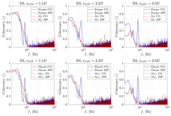 Spectral cohesion between rotor and blade loading quantities and the fluid velocity measurements taken at differing upstream positions for the D3 case. The upper charts show torque-wise loading and the lower charts show thrust-wise loading.