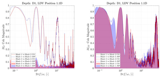 Spectral cohesion between blade loading quantities for the D1 case. The left chart shows torque-wise loading and the right chart shows thrust-wise loading.
