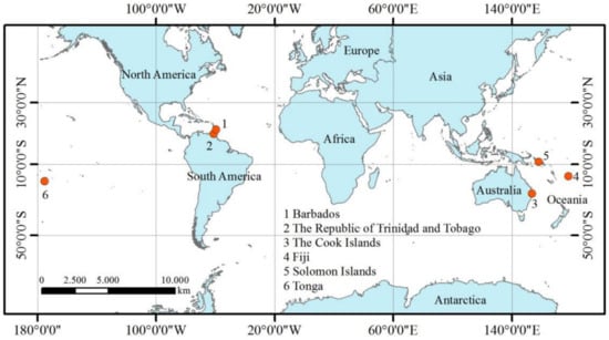 In the first step, the sampled countries, including Barbados, Trinidad and Tobago, The Cook Islands, Fiji, Solomon Islands and Tonga (Figure 2), have been selected.Table 2 shows the characteristics of these countries in terms of population, areas and GDP. This list of countries and case studies is not exhaustive, and each island State could be considered in greater depth and detail. However, this study is aimed at providing a realistic account of opportunity over the challenge. Thus, this study presents some relevant geographic information on SIDS and their limits to the adaptation of CC. The main reason for selecting these suggested case studies is to show the successes from which to learn and the gaps that need to be addressed for future development planning in SIDS. The examples from the Pacific include some of the larger SIDS, e.g., Fiji and Tonga. For instance, in the Caribbean SIDS, most data are available only in Spanish, making it challenging to collect and analyse for non-Spanish speakers.