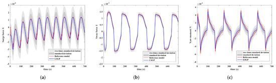 In order to better explain the pros and cons of the LSGP algorithm, we demonstrate how the proposed algorithm can be executed on full-scale experimental data for different manipulation scenarios. The proposed ship motion model based on LSGP can better approximate the original ship model. As shown in Figure 3, since the corresponding system input and output are different from the previous identification modeling, the relationship between the ship’s motion state and the external force on the ship is considered. Figure 4, Figure 5 and Figure 6 shows the results of three sets of simulation experiments in Table 1. It can be seen that the non-parametric model under LSGP method has good generalization, except for deviation of the Yaw moment N of the simulation prediction. This is because the ship Yaw moment is relatively complex, has strong nonlinearity and is difficult to decouple from the motion state in other DOF.