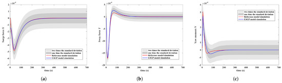 Comparison results of non-dimensional with the simulated T- test. (a) is about the Surge force of the “mariner”; (b) is about the Sway force of the ship; (c) is the situation of Yaw moment of the ship; the figure shows one and two times the standard deviation bandwidth respectively.