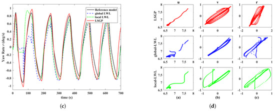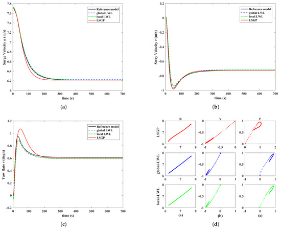 From the above simulation results that the LSGP algorithm has a certain prediction simulation effects, and low requirements for training data. This property is determined by the nature of the LSGP algorithm. It is the main line of this paper to predict the external force of the ship through identification modeling, and to further calculate the trend of the ship’s motion at the next moment according to the Equation (25) in real time, and then to predict the state and trajectory of the ship’s motion. The simulation prediction results of the mariner test are shown in Figure 7, Figure 8 and Figure 9, and a comparison based on the two LWL (global LWL [9], local LWL [22]) algorithms is also given.