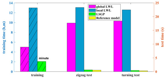 It can be seen intuitively from Table 2 that LSGP has advantages over other methods in the zigzag test, generally, Global LWL < local LWL < LSGP, and the simulation accuracy in the turning test needs to be improved, which is related to the fact that our training data does not include turning data. At the same time, three algorithms are given about the time spent in training and simulation prediction, as shown in Figure 10.