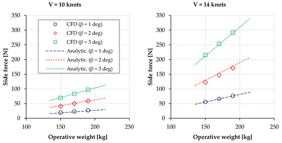 where ρ w is the sea water density, V is the boat velocity and β is the leeway angle. The reference surface S H is the side projection, on the symmetry plane, of the submerged part of the demihull and changes with displacement. It is modelled, for a typical A-Class hull shape, by two formulations approximating a set of values computed by a CAD system and valid before and after a defined operative weight W B O 0 :