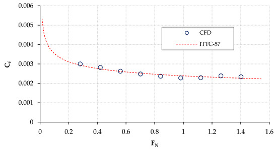 The form factor ( 1 + k ) accounts for the over velocity generated by the thick shape of the body [20]. Its value is evaluated from literature or from a known bare hull drag value. The skin friction coefficient is estimated according to the ITTC-57 friction line expression [21]: