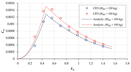 The factor ( W B O + w w ) accounts for the dependency from the operative weight and is tuned by the term w w . The values of w w , k w 1 , k w 2 and k w 3 are to be tuned against the matrix of the known demihull solutions. If a large database of hull solution is available, the combination of values that best match the data might be identified with a trial-and-error procedure. The values adopted for the reference hull were identified by a numerical optimization procedure that converges toward the combination of values that minimize the absolute difference between the analytical formulation and the computed CFD values. To further best match the data, the boundary Froude number might differ from the theoretical critical value of 0.4 referred to the waterline length. The Figure 6 compares the solutions of the analytical wave drag model with the CFD solutions of the reference hull at two operative weights.