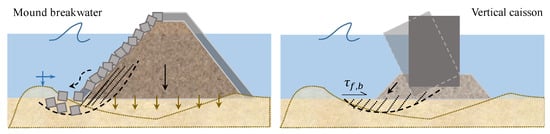 Coastal structures, such as seawalls and breakwaters, provide protection from the effects of the sea and create the conditions for economic growth in coastal environments. These maritime structures also protect ports and coasts against sea dynamics, and their function will be even more important in the upcoming years due to sea level rise and coastal regression as a result of global warming [1]. Regarding maritime structures and nearby environments, the effects of sea level rise will include: increasing levels of sediment transport and erosion, higher impacts of wave energy on structures, the loss of stability, and increasing overtopping events [2]. On the other hand, increased maritime traffic and human activities along coasts make the proper study and modelling of wave–structure–seabed interactions indispensable in achieving a balance between human intervention, costs, and environmental impacts.