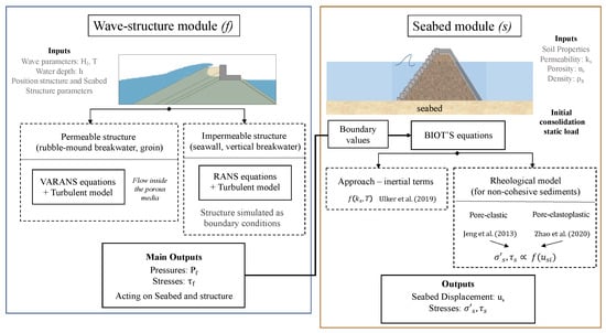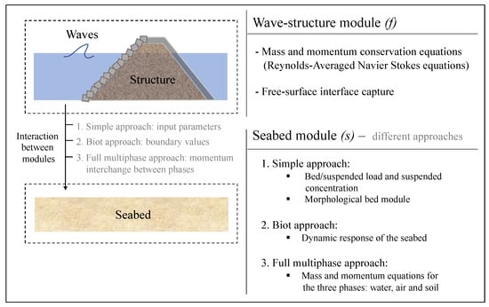 An alternative to the simple method for describing wave-–seabed interactions around marine structures is to combine Biot theory [85] (see Equations (11)–(13)) with the Navier–Stokes (NS) equations for the wave field. This numerical approach studies the wave–structure–seabed interactions with two modules: (1) the wave–structure module, based on RANS or VARANS equations as with the simple approach (see Section 3.1.1), and (2) the seabed module (described below) in which the Biot’s equations govern the dynamic response of the porous seabed under wave loading. Figure 9 presents a summary of the modules that are presented in this numerical approach.